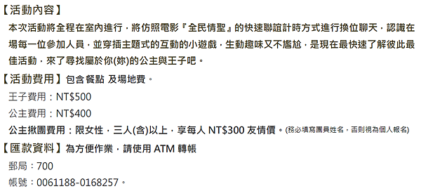 報名前請務必詳讀『活動流程/注意事項』及『取消規定』再報名,填寫報名資料即視為您已同意活動規範!